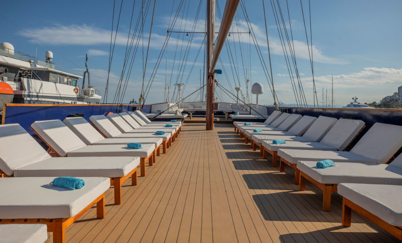Construit au milieu des années 1990 sur le modèle d’un caïque traditionnel, cet élégant bateau rénové en 2025 allie charme rétro et confort moderne. D’une longueur de 48 mètres pour 10 mètres de largeur, il navigue à une allure de 11 nœuds (20 km/h) grâce à la puissance de ses deux moteurs – le bateau manœuvre toujours au moteur (les voiles sont utilisées occasionnellement quand la météo le permet). Notez que votre itinéraire peut être modifié en cas de mauvais temps (vent supérieur à 6 sur l’échelle de Beaufort). Aménagé sur quatre niveaux, le M/S GALILEO offre 24 cabines, toutes équipées de 2 lits bas ou 1 grand lit, 1 ou 2 hublots, douche, WC, sèche-cheveux, téléphone interne, petit frigo, coffre-fort et climatisation; les cabines de catégorie A peuvent accueillir une 3e personne en couchette superposée. Le pont soleil dispose de chaises longues et le pont supérieur abrite le bar extérieur. Le pont principal accueille l’espace « lounge » et son bar ainsi que la salle à manger. La cuisine à bord est servie sous forme de buffet mais aussi à la carte. Les boissons (eau minérale, café et thé) sont incluses. La langue parlée à bord est l’anglais.