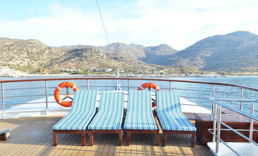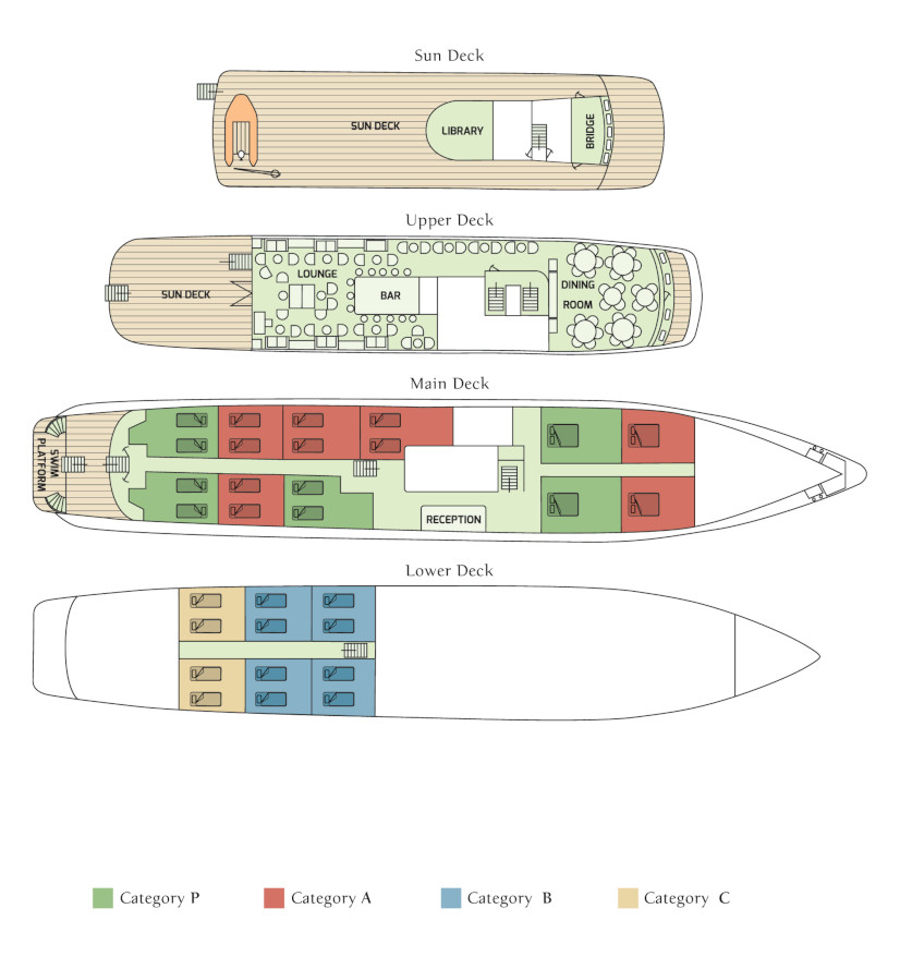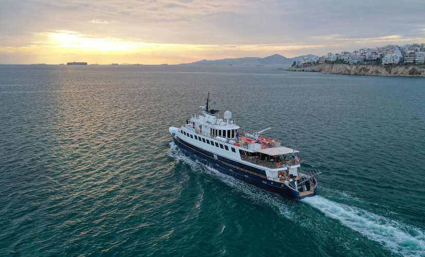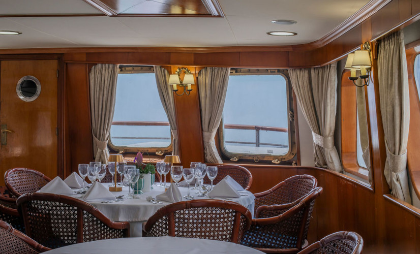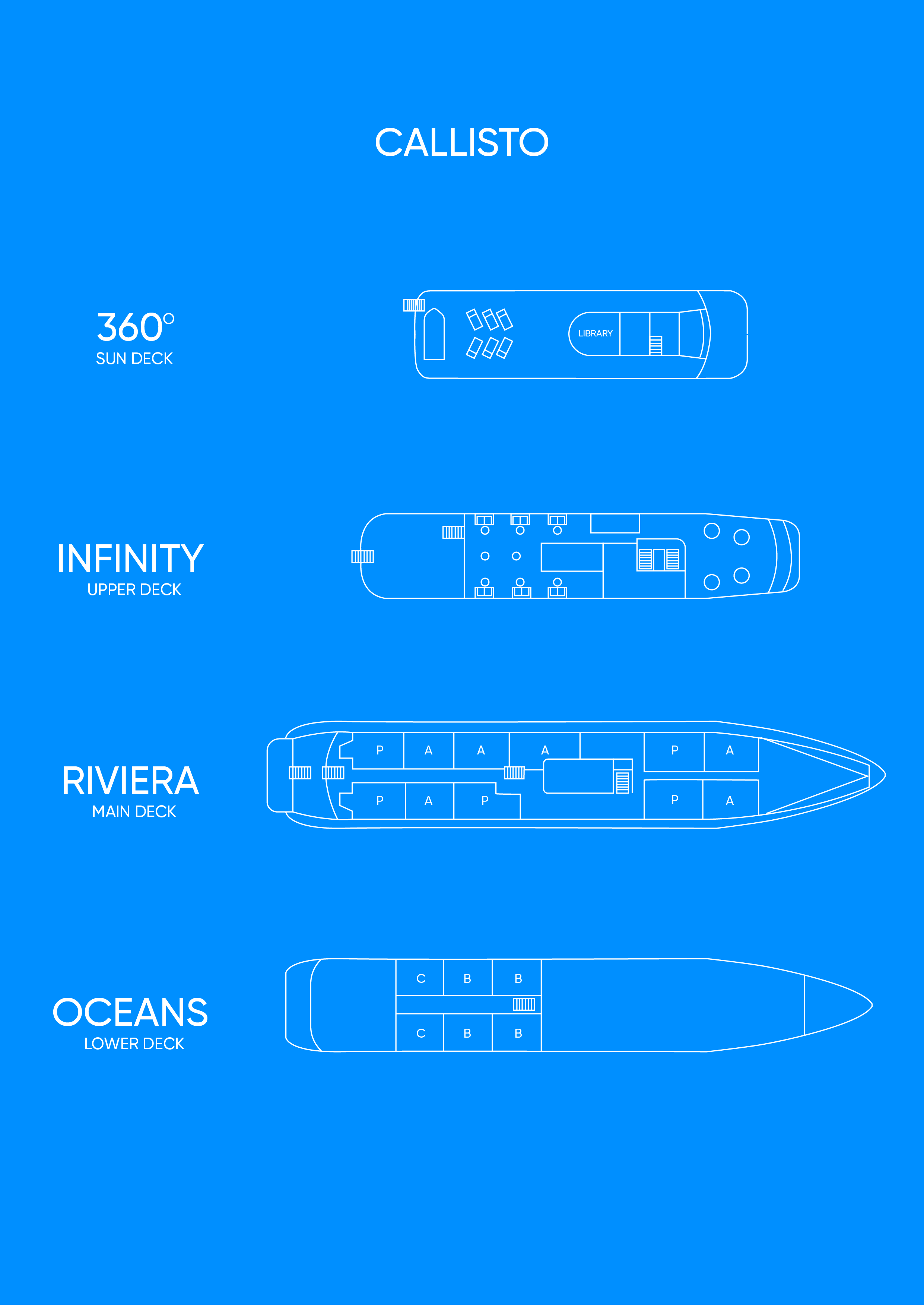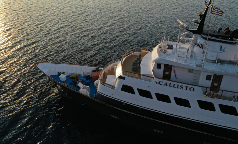Le « M/Y Callisto » reste fidèle à son nom: beau, élégant et classique. Il a été entièrement reconstruit en 2000 et rénové en 2015. Long de 52 mètres et large de 9 mètres, il navigue au moteur et à une vitesse moyenne de 10 nœuds (environ 19km/h). Il compte 17 cabines réparties sur 2 ponts, toutes équipées de 2 lits bas ou 1 grand lit, douche, WC, sèche-cheveux, climatisation, téléphone interne, télévision, coffre-fort et petit frigo. Les cabines des ponts inférieurs disposent de hublots et celles du pont principal de grandes fenêtres. Les cabines de catégorie C et B peuvent accueillir une 3e personne. Une plage arrière permet de se baigner en mer quand cela est possible. Sur le pont supérieur se trouve la salle à manger, le bar et le lounge. Bibliothèque sur le pont soleil. Les boissons (eau minérale, café et thé) sont incluses. La langue parlée à bord est l’anglais.