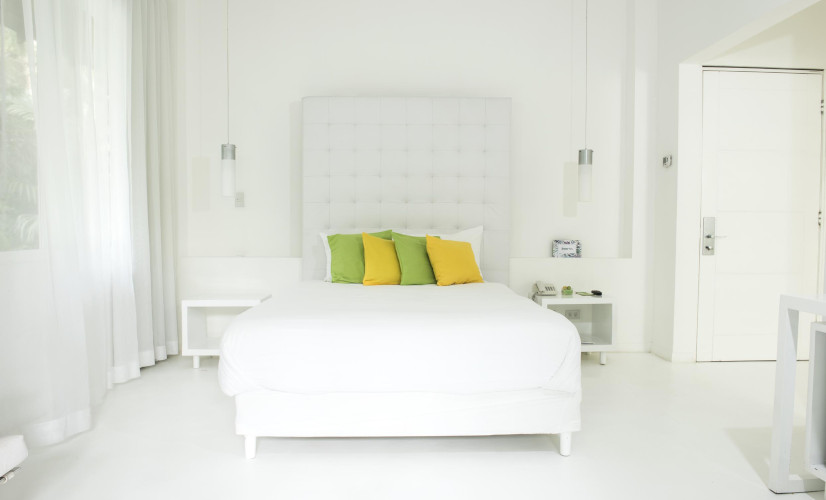 51 chambres et suites d'un blanc immaculé avec des touches colorées, toutes équipées de salle de bain complète, minibar, télévision, coffre-fort, climatisation et balcon avec vue sur le jardin luxuriant. Certaines suites se situent directement en bord de plage.