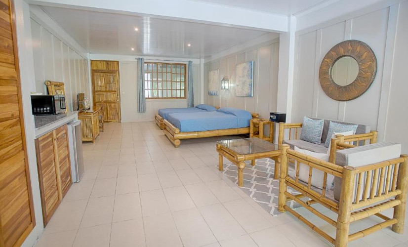16 suites, chacune équipée d’un grand lit, salle de bain complète, télévision, minibar, climatisation, coffre-fort, kitchenette équipée et terrasse donnant sur le jardin.
