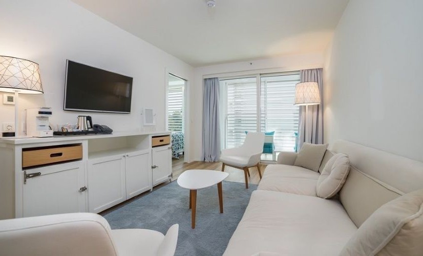 77 chambres et 8 appartements, décorés dans le style classique et tous dotés de bain ou douche, WC, sèche-cheveux, télévision, petit frigo, coffre-fort et climatisation. La plupart des chambres offrent un balcon avec vue sur les jardins ou la mer.