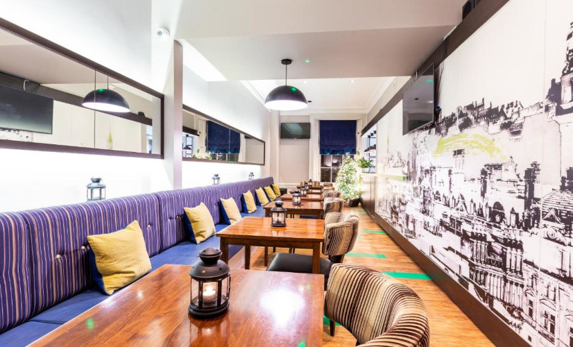 Salle pour le petit déjeuner. Bar et restaurant à 5 minutes à pied à l'hôtel Indigo.