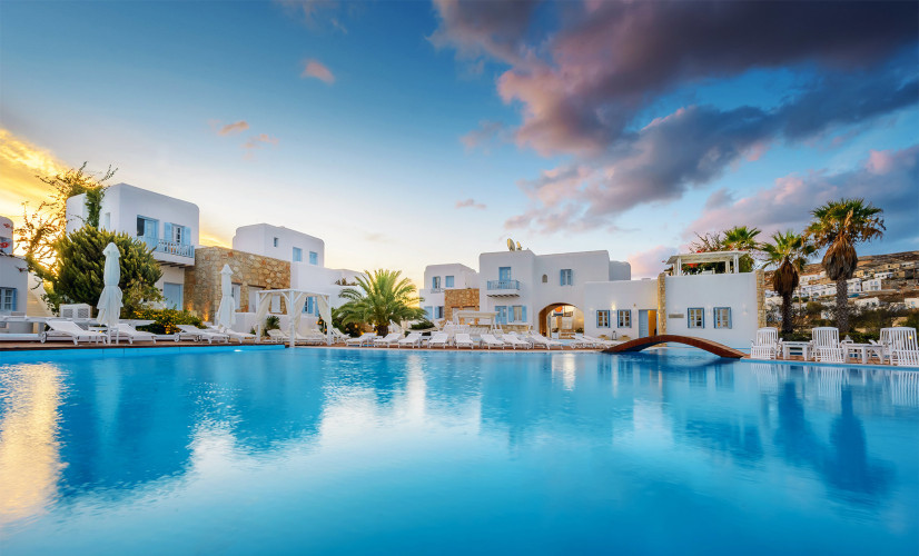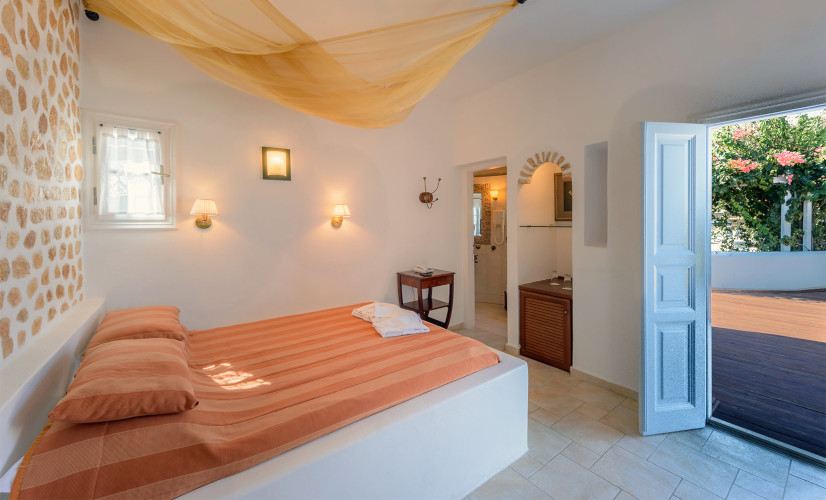 24 chambres et suites de bon standing, toutes équipées de salle de bain complète avec sèche-cheveux, téléphone, télévision, petit frigo, coffre-fort, climatisation, balcon ou terrasse donnant sur le jardin, la piscine ou la ville de Chora. Les suites peuvent accueillir jusqu’4 personnes.