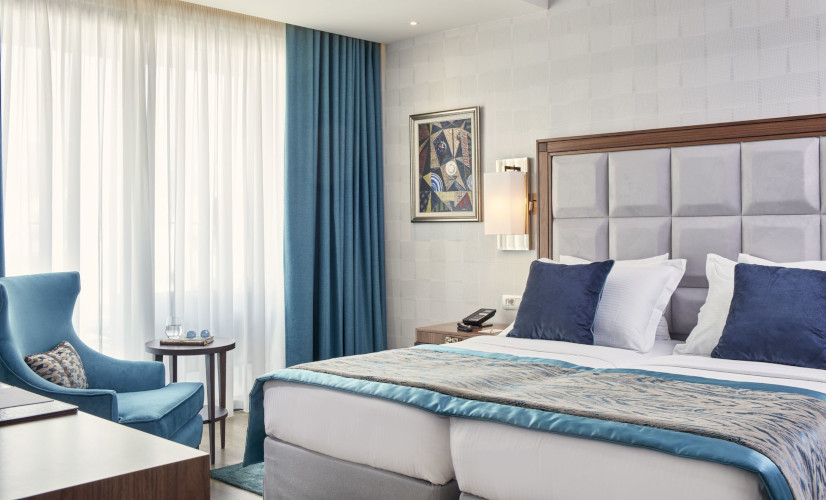 216 chambres et suites élégantes toutes avec salle de bain complète, WC, sèche-cheveux, téléphone, télévision, climatisation, coffre-fort et petit frigo, avec vue sur la vieille ville et l’Acropole.