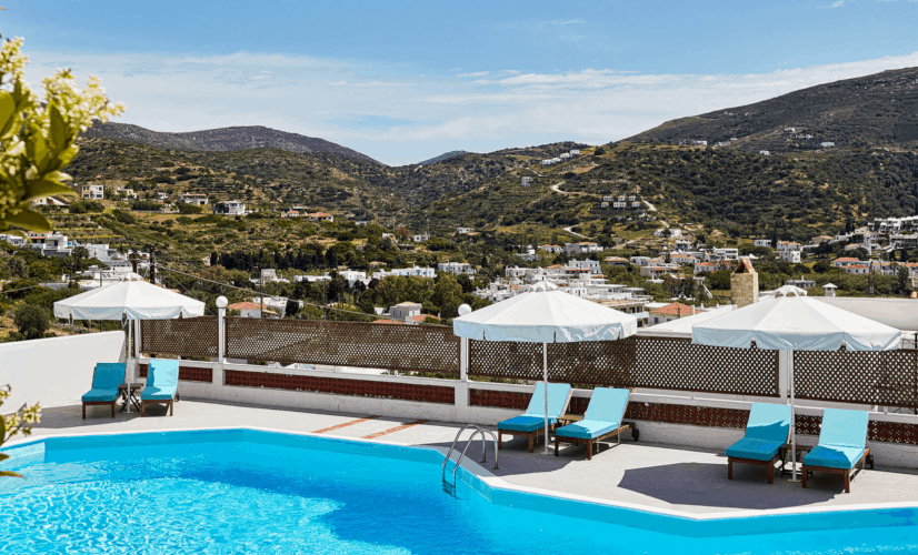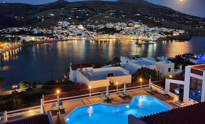 Andros, dans le petit village de Batsi et surplombant la plage de Mpatsi. La plage se trouve à quelques minutes à pied et le port d’Andros à 10 minutes de route.