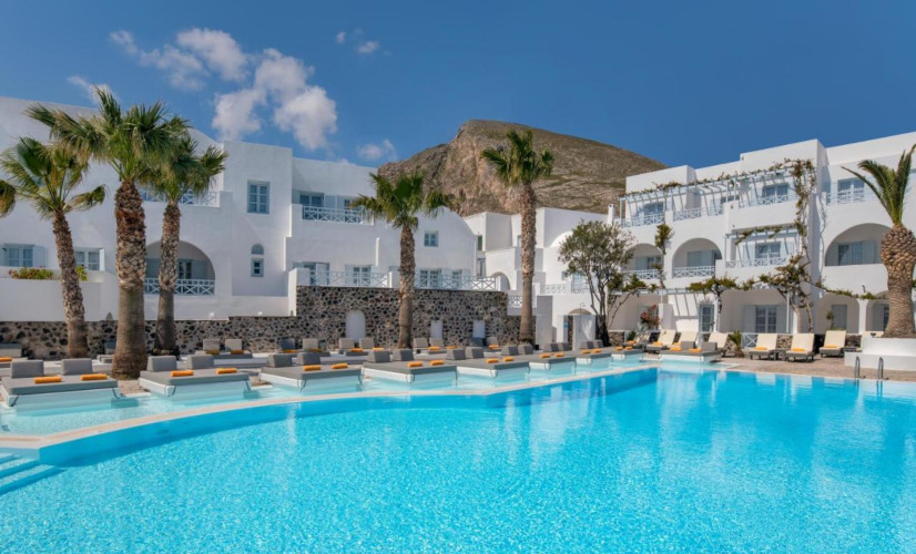 Santorin, à Kamari et à 5 minutes à pied de la plage de sable noir.