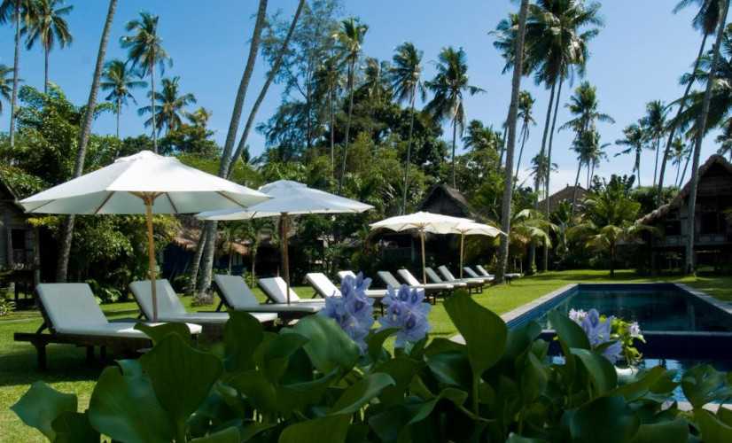 Ensemble de villas à l’architecture locale au milieu d’une végétation luxuriante, restaurant, piscine, galerie-boutique, bibliothèque.