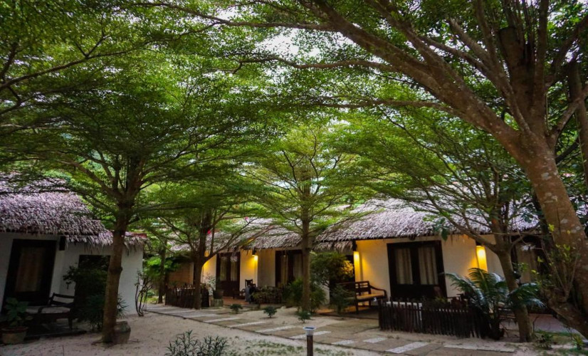 Complexe avec une partie avec des chambres et à 500 mètres, une autre partie avec des villas individuelles nichées dans un jardin fleuri, restaurant.