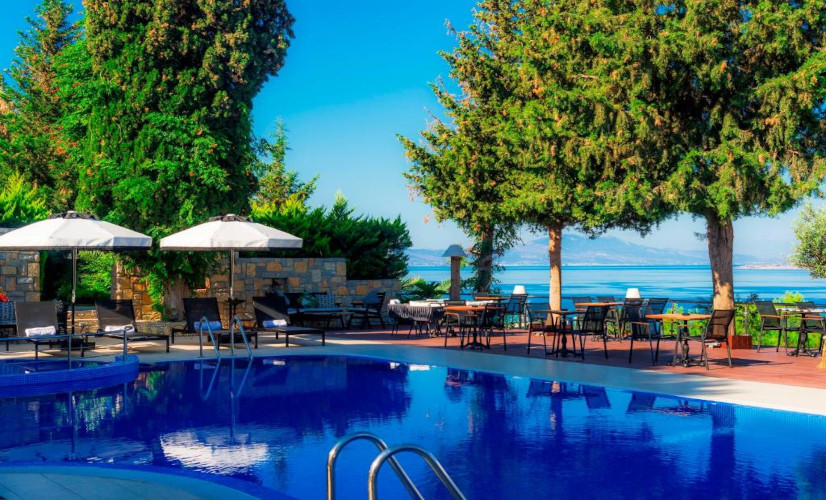 Petits bâtiments tout blancs adossés à la colline, dominant le jardin et la piscine ; 2 restaurants et snack-bar près de la piscine. 2 piscines équipées de chaises longues et parasols, bassin pour enfants. Soins de beauté et de relaxation (contre paiement). La plage publique (sable et gravier) est à seulement 500 mètres.