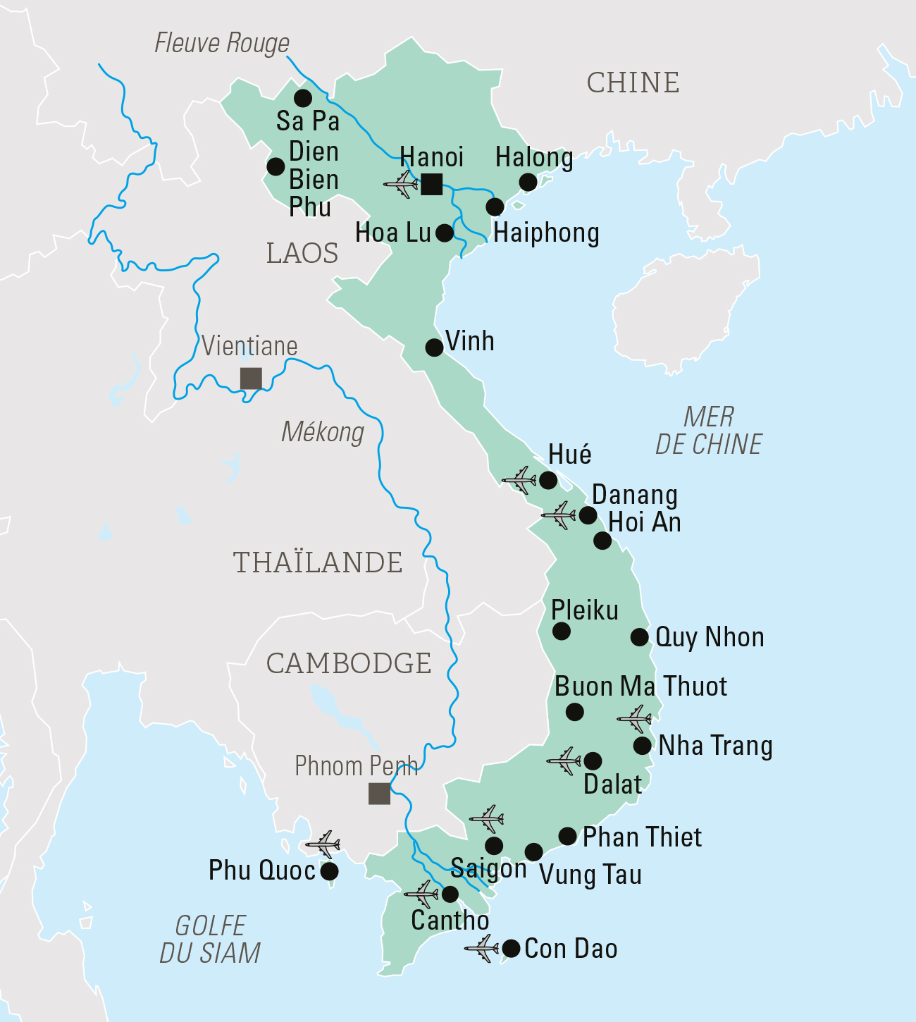 Deux pleines semaines pour un circuit complet, avec la visite des principaux centres d’intérêt du pays : minorités nationales dans le Moyen Tonkin, splendeur naturelle de la baie de Halong, cité impériale de Hué et cosmopolitisme de Saigon ainsi que le vaste delta du Mékong et ses marchés flottants.