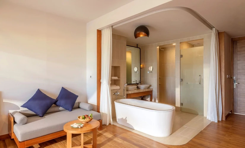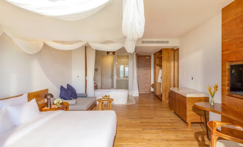 140 chambres et 36 villas avec piscine toutes équipées de bain, douche, WC, sèche-cheveux, climatisation, téléphone, télévision, minibar, coffre-fort et terrasse avec vue sur la mer ou sur le jardin.