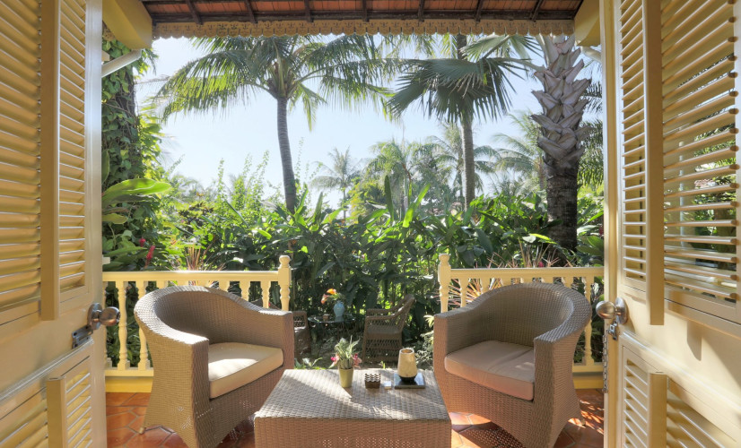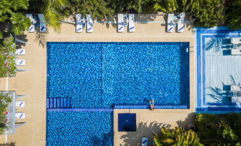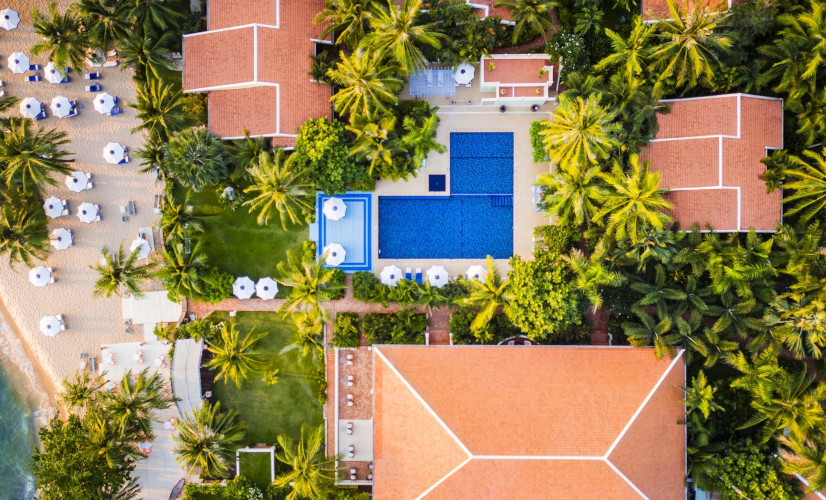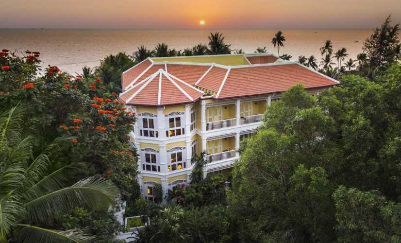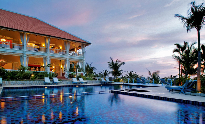 Un bâtiment et des annexes construit dans le style des anciennes maisons françaises de bord de mer: 2 restaurants, bars, piscines, centre de bien être et centre de sports nautiques.